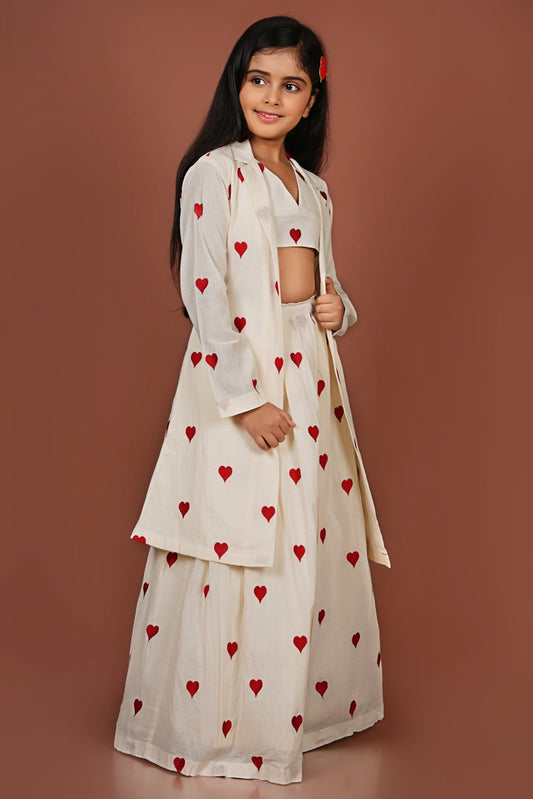 Adorable Embroidered red heart off-white Jacket with Top and Lehenga Set