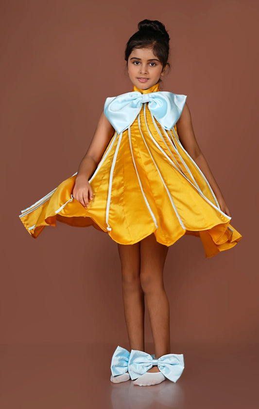 Vibrant mustard dress paired with a striking ice blue bow for a bold, contrasting look.