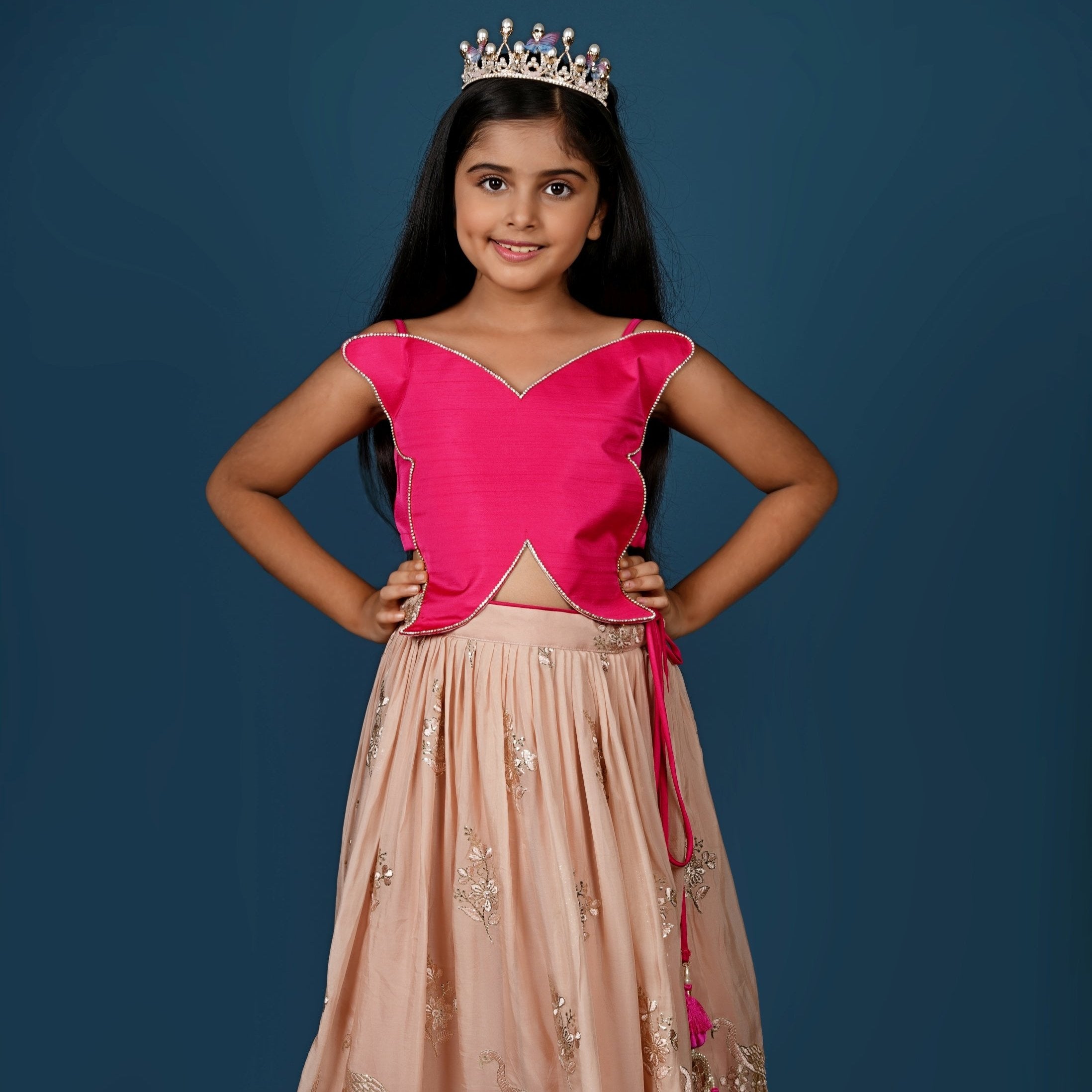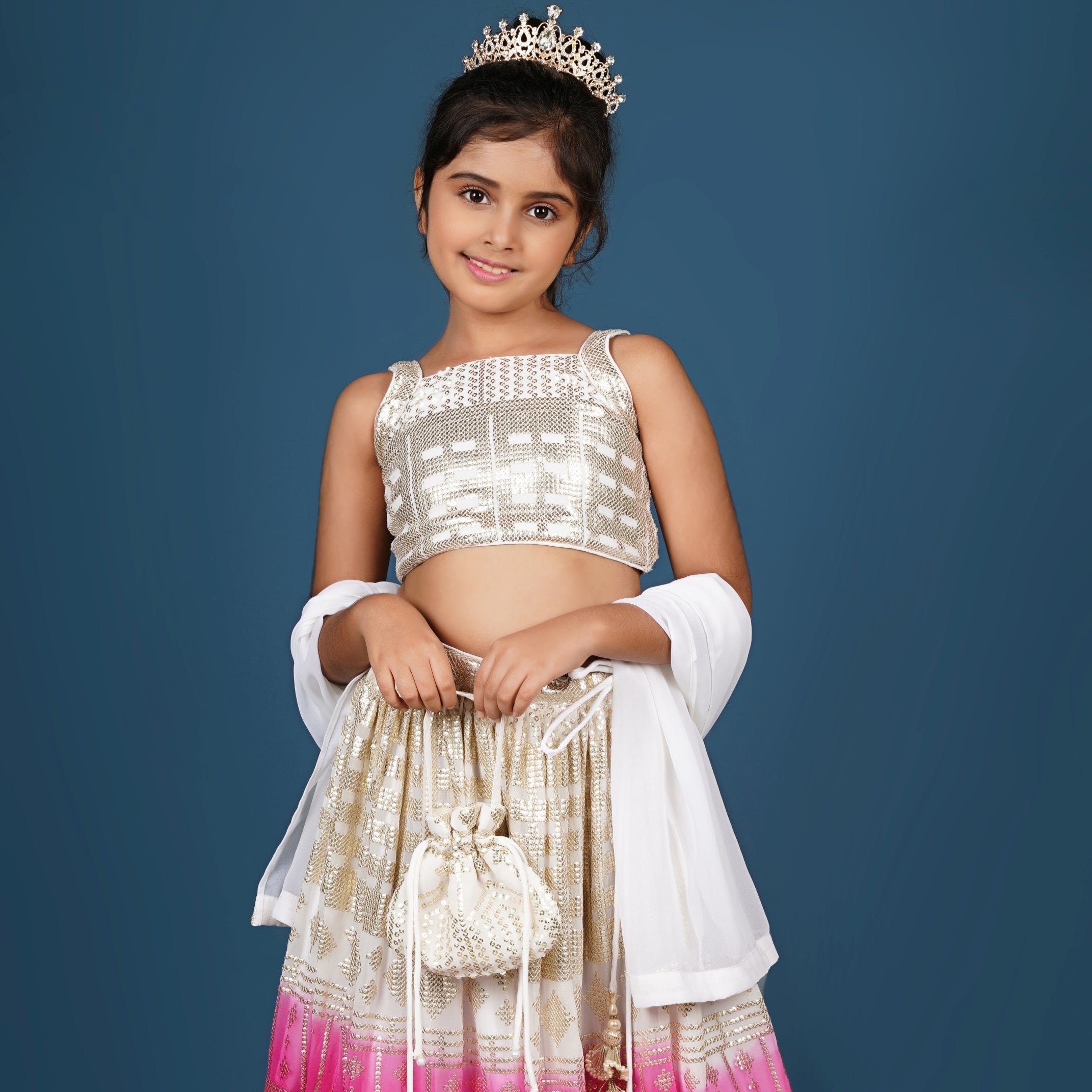 features a sequin-embellished top and lehenga. The sparkling details and vibrant colors make it perfect for festive occasions. Dress your little one in style with this handcrafted masterpiece. -