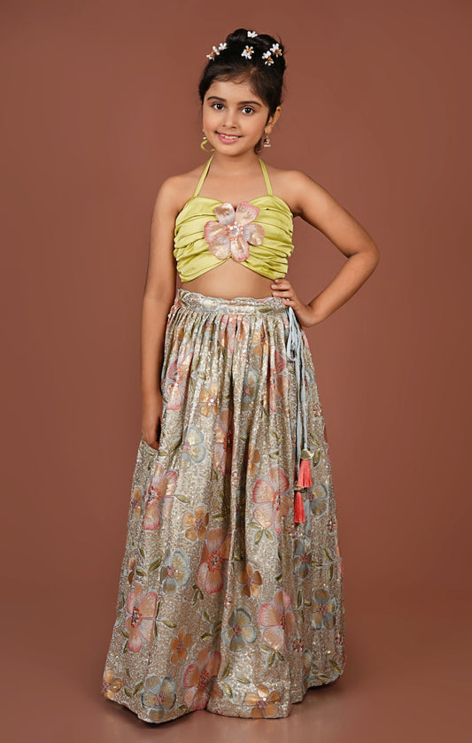 Sequined Flowered Halter Top & Lehenga Set