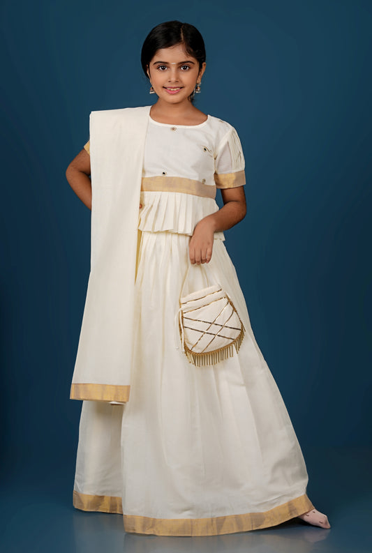 Glimmering Cream Peplum Top with Golden-Bordered Lehenga Set