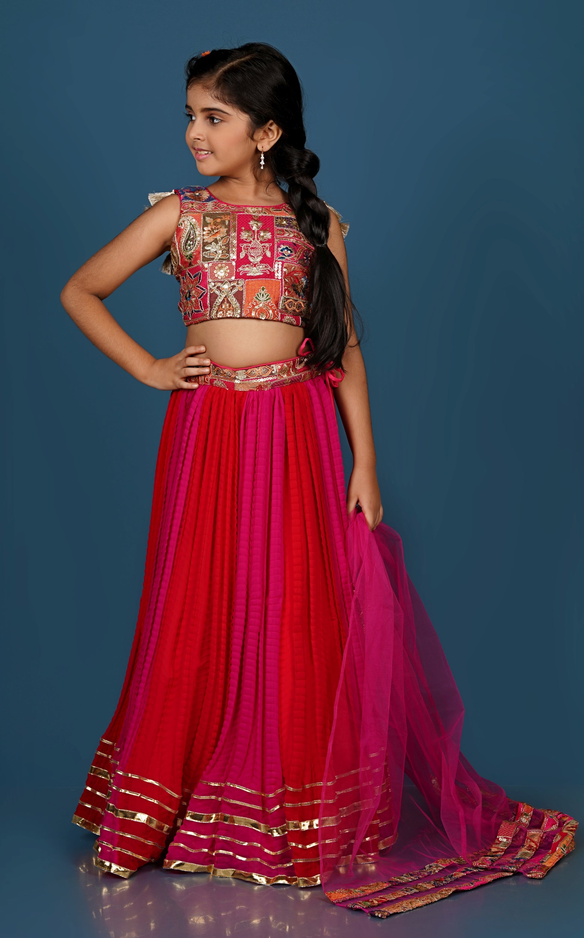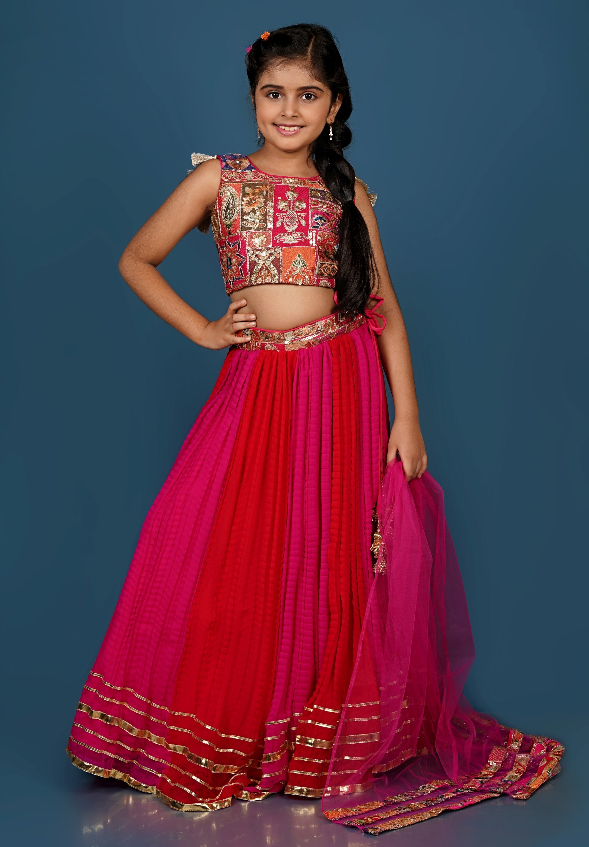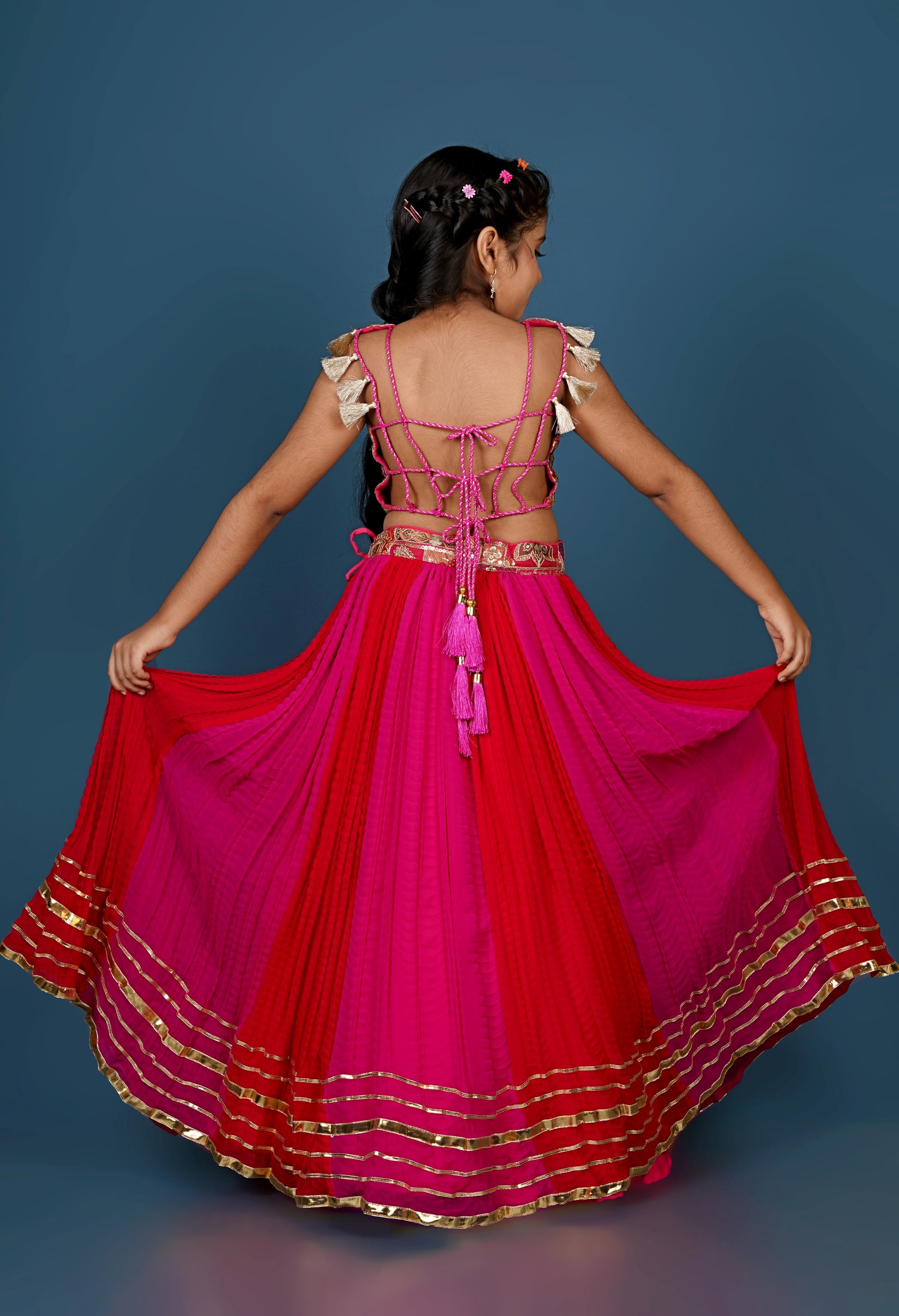 Lehenga with adjustable drawstrings and gota flower tassels attached to it with zip at side.