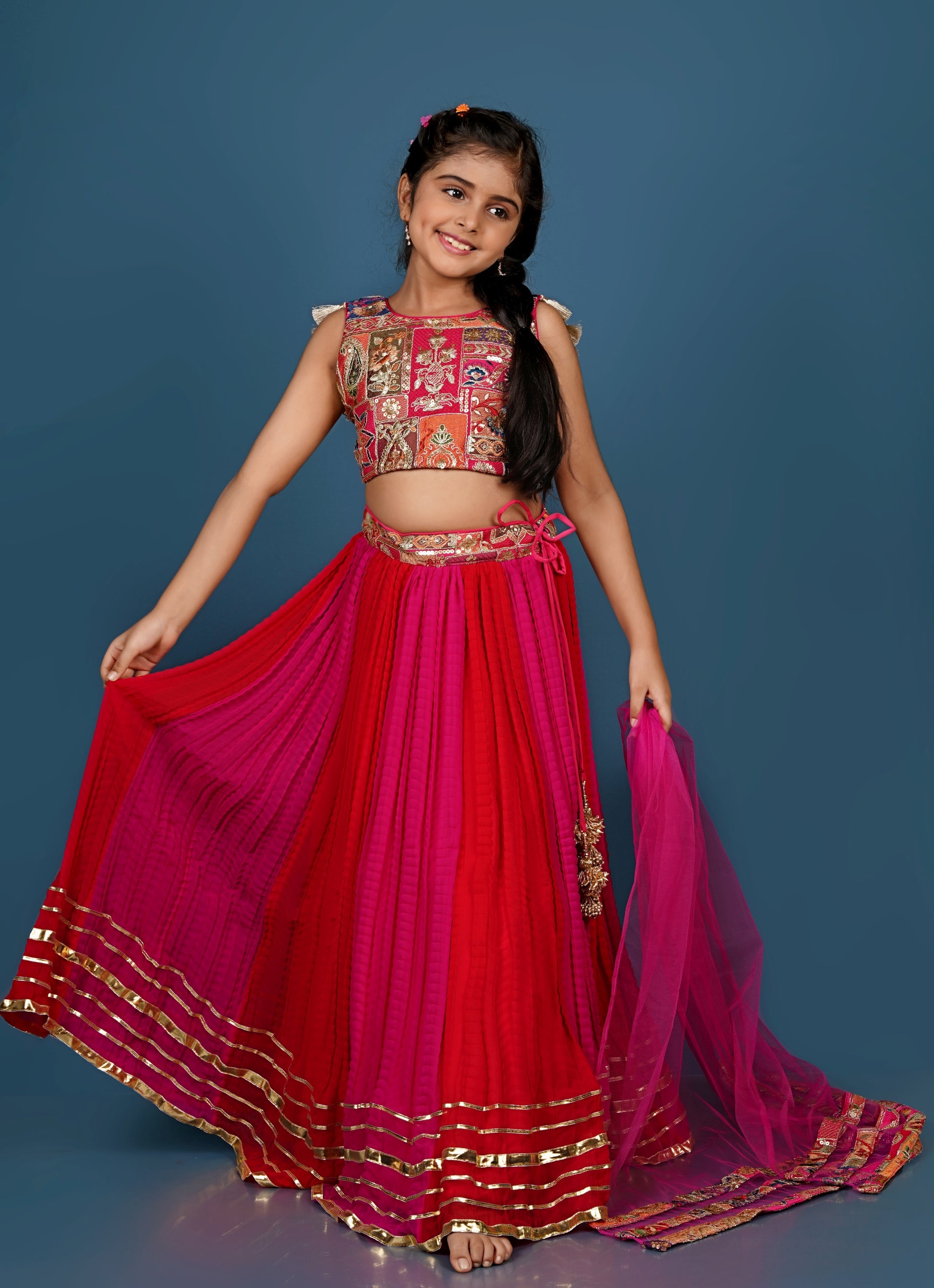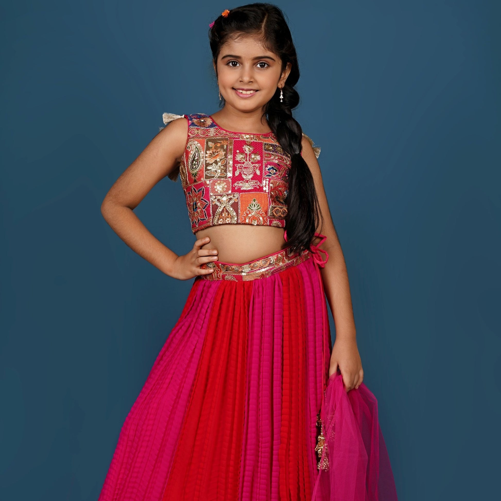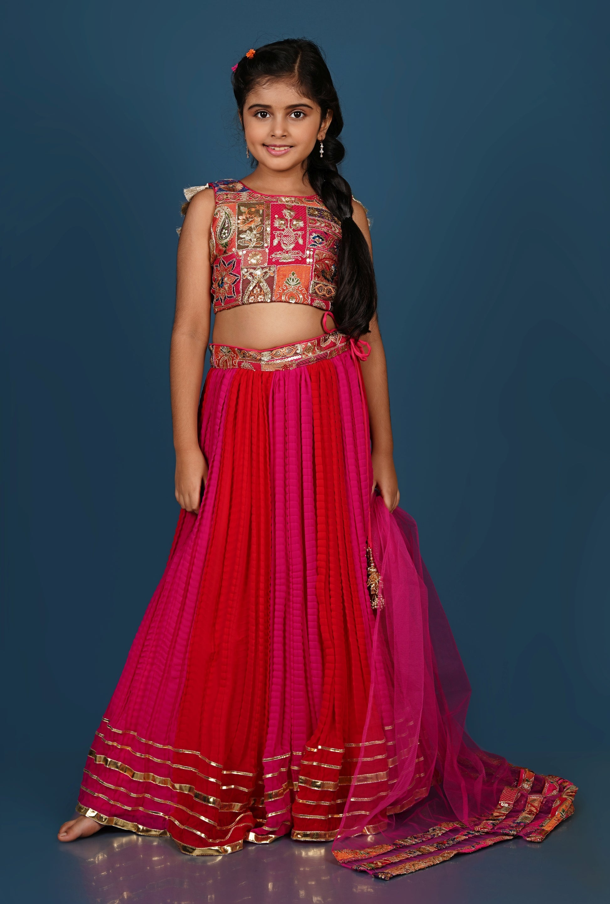 Lehenga with adjustable drawstrings and gota flower tassels attached to it with zip at side.