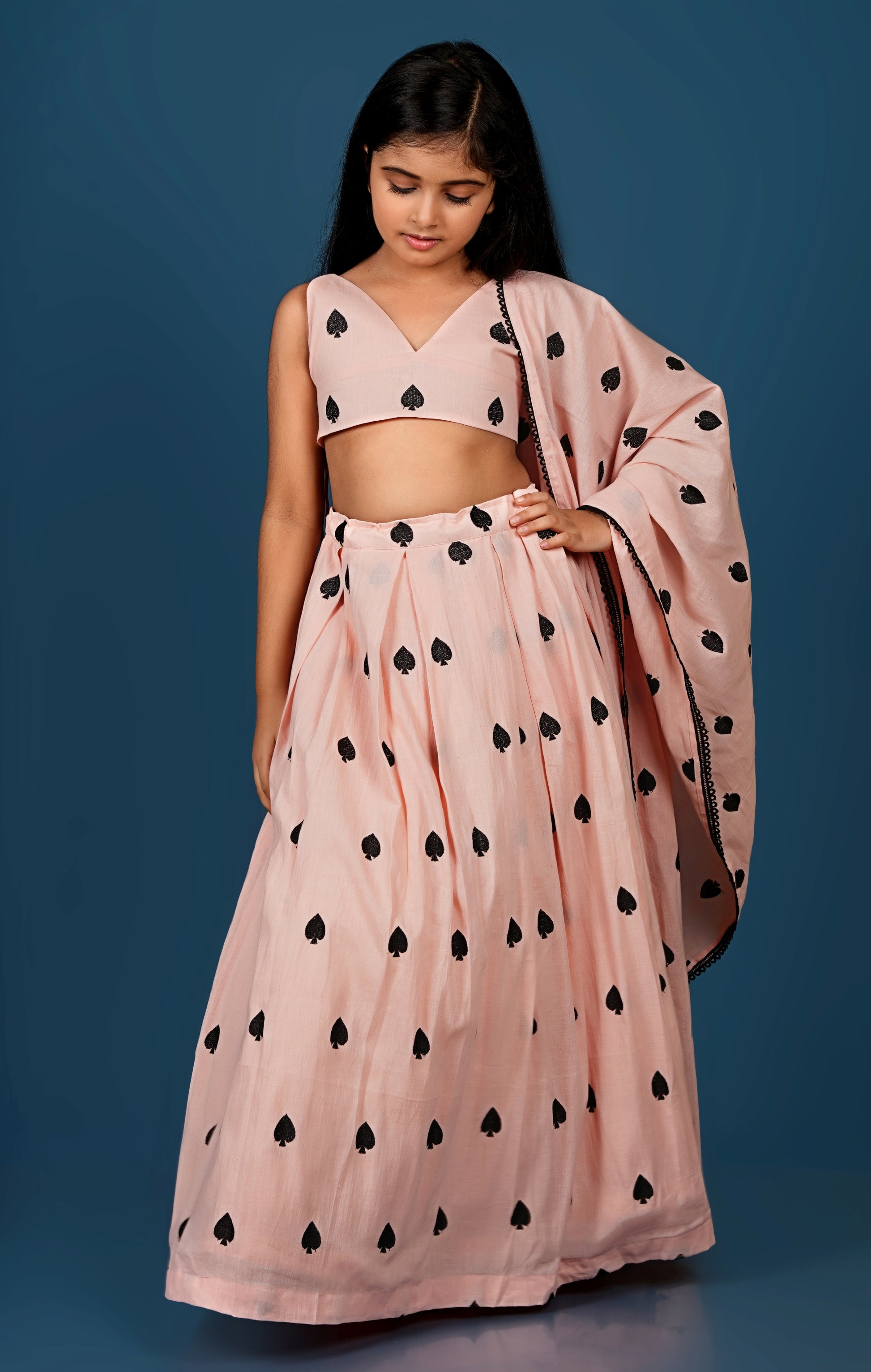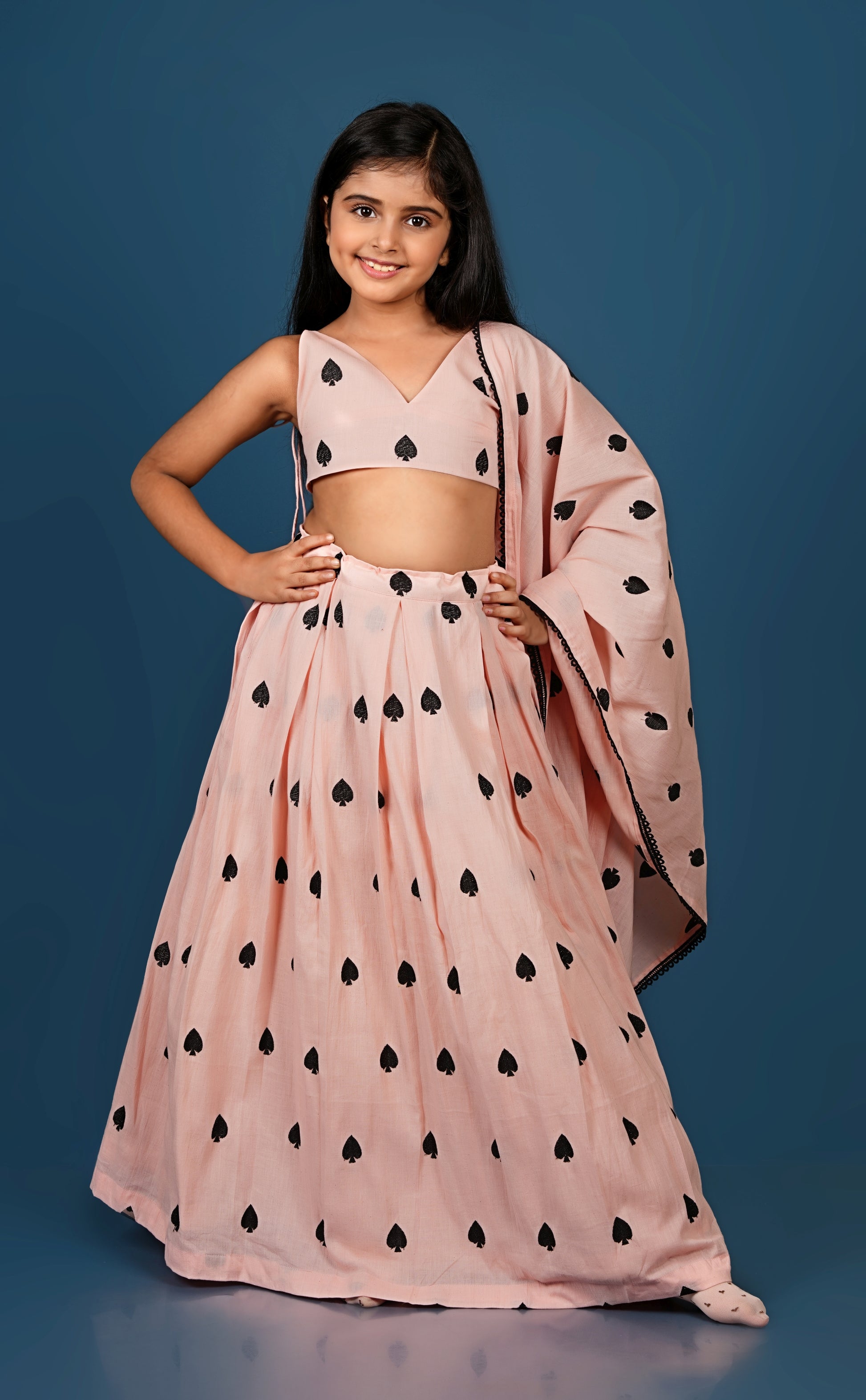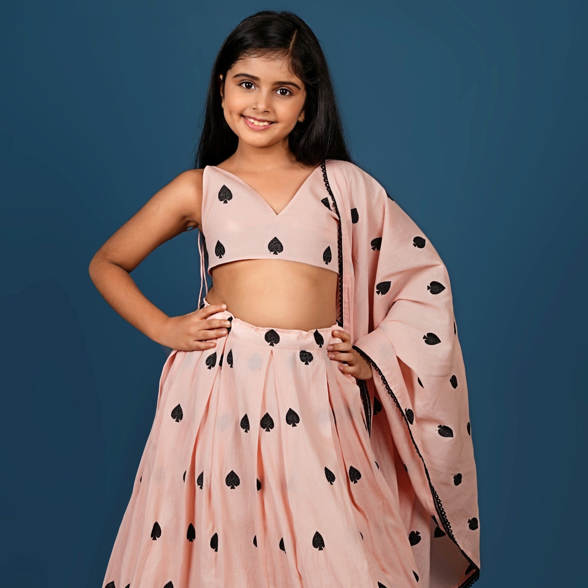 Top and Lehenga with black spades embroidered on it.