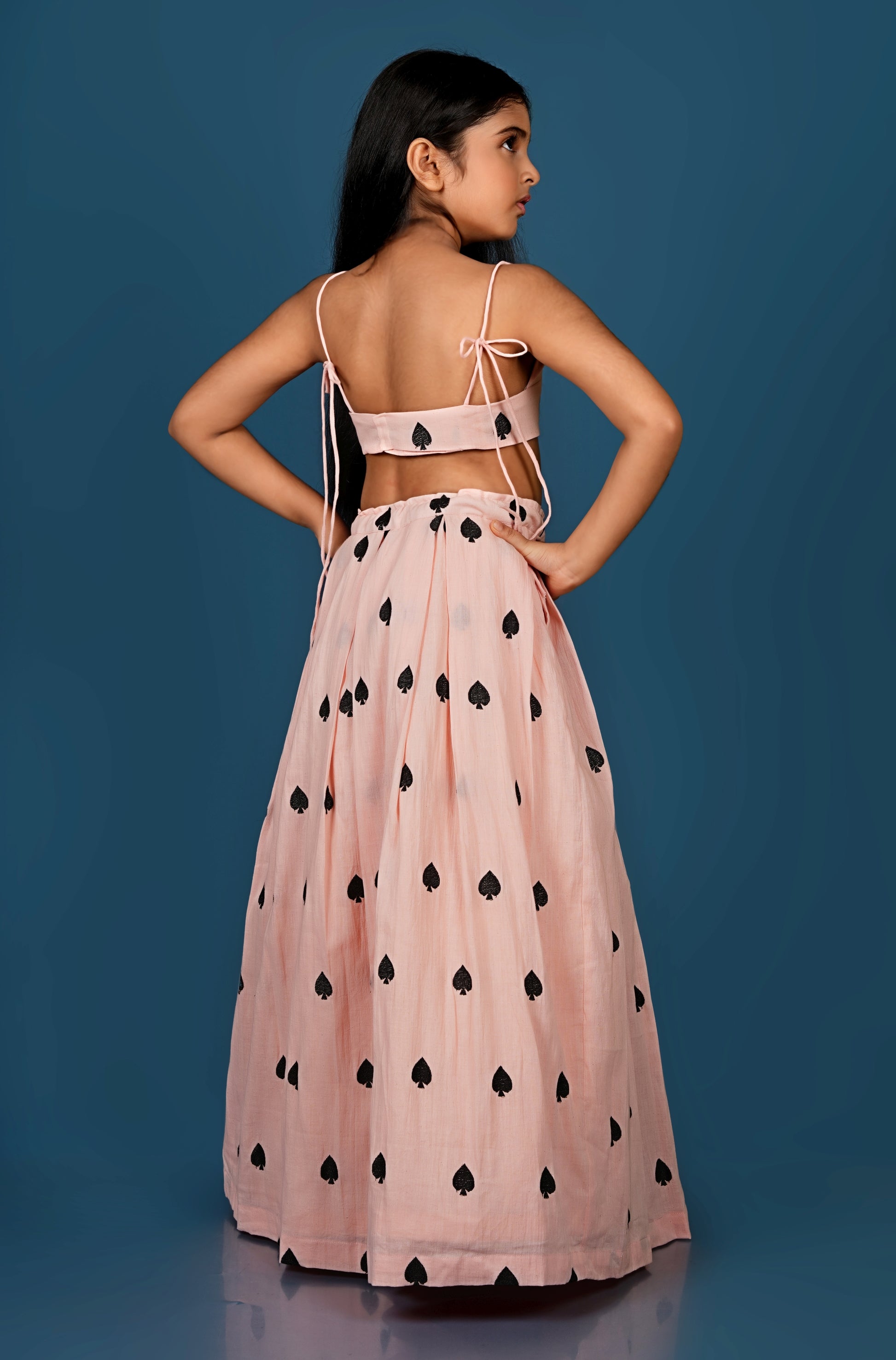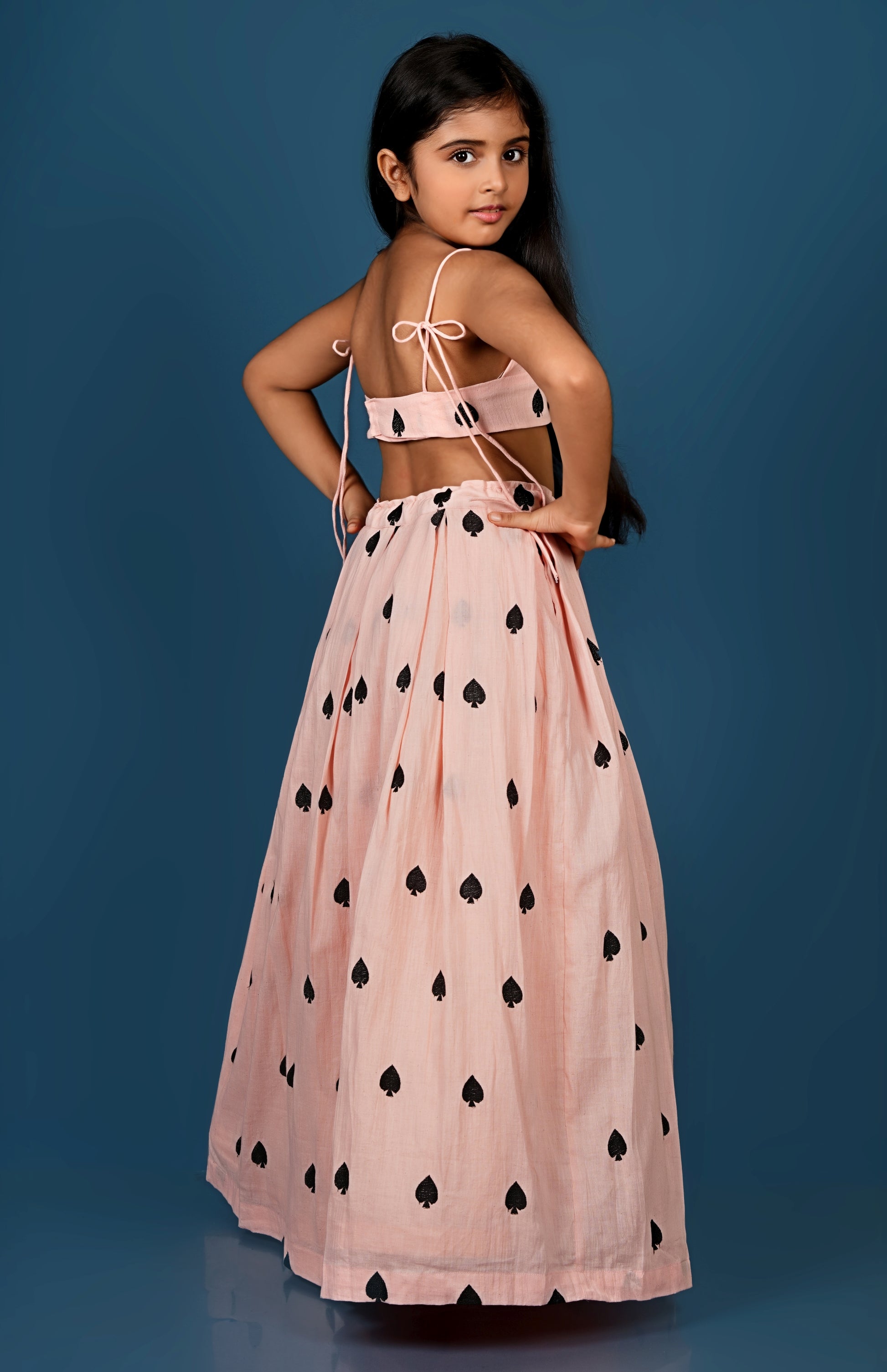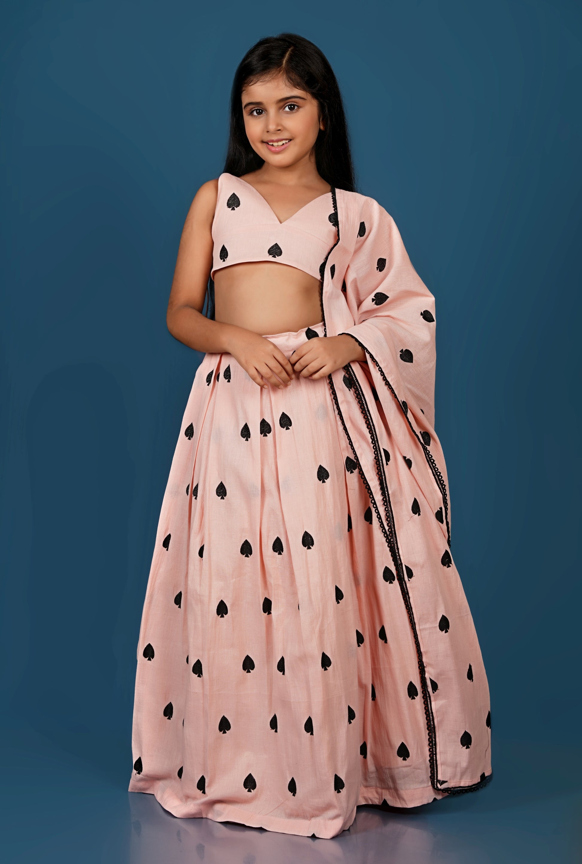 Top and Lehenga with black spades embroidered on it.