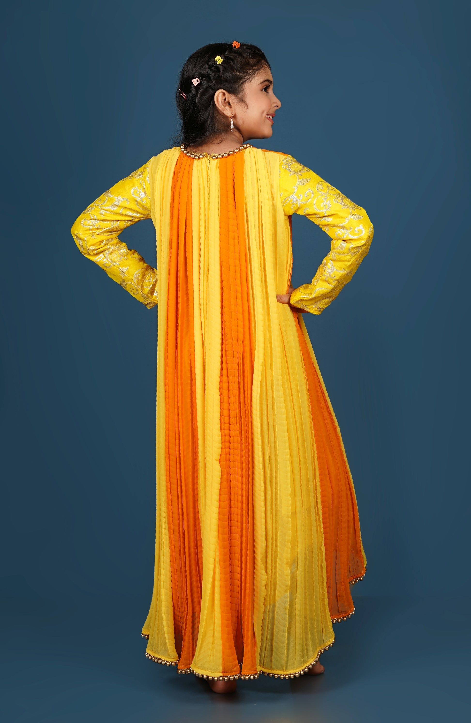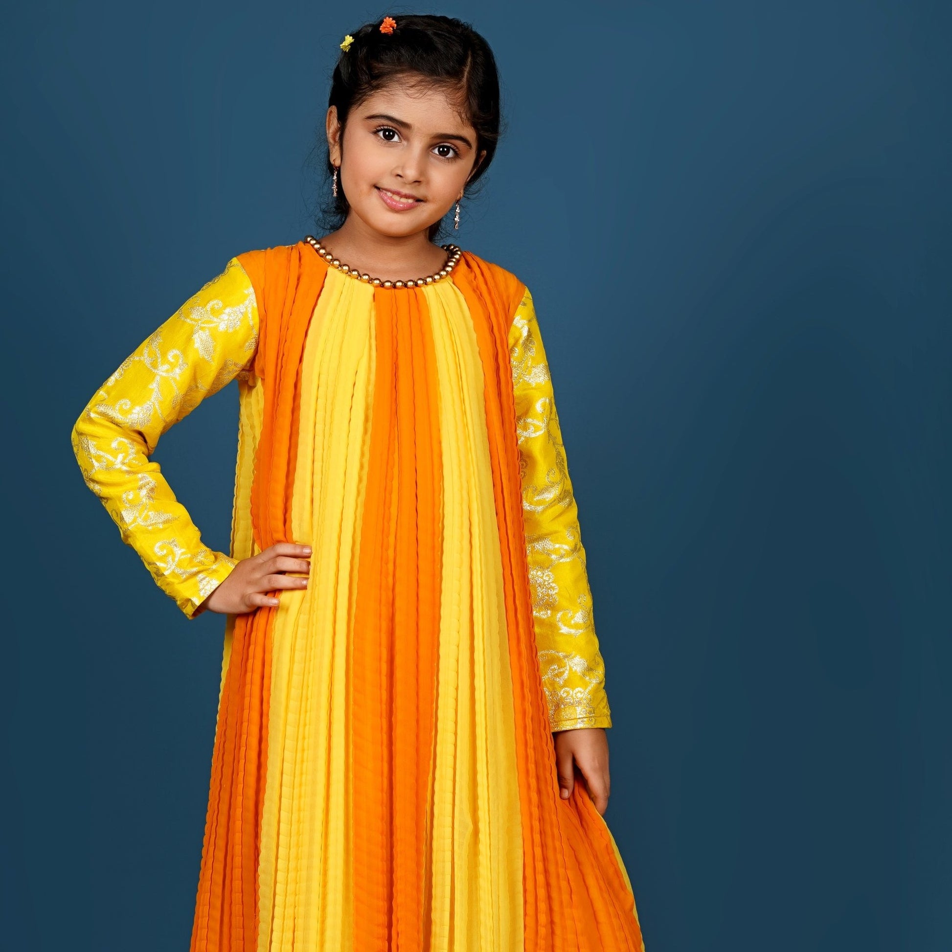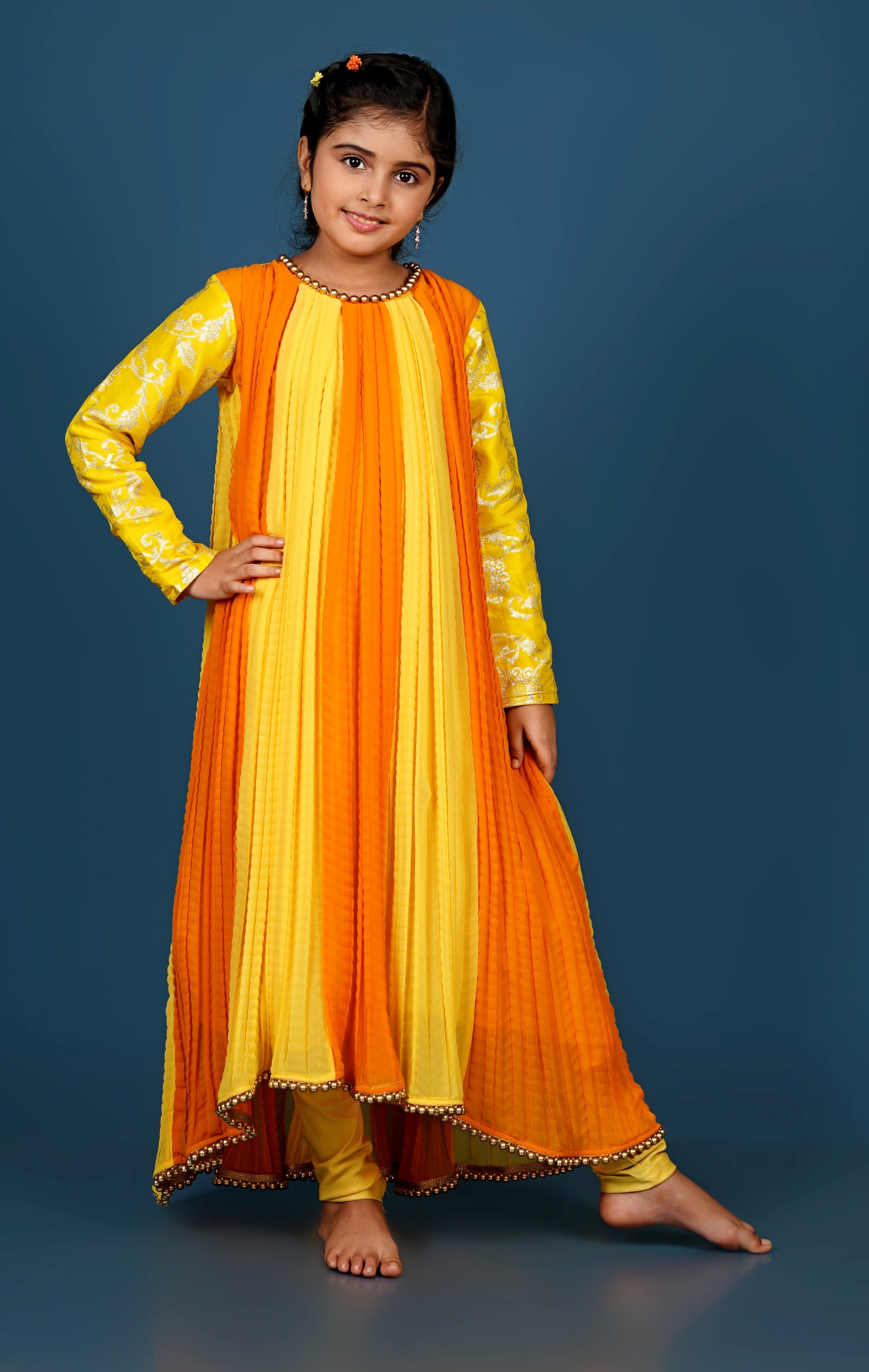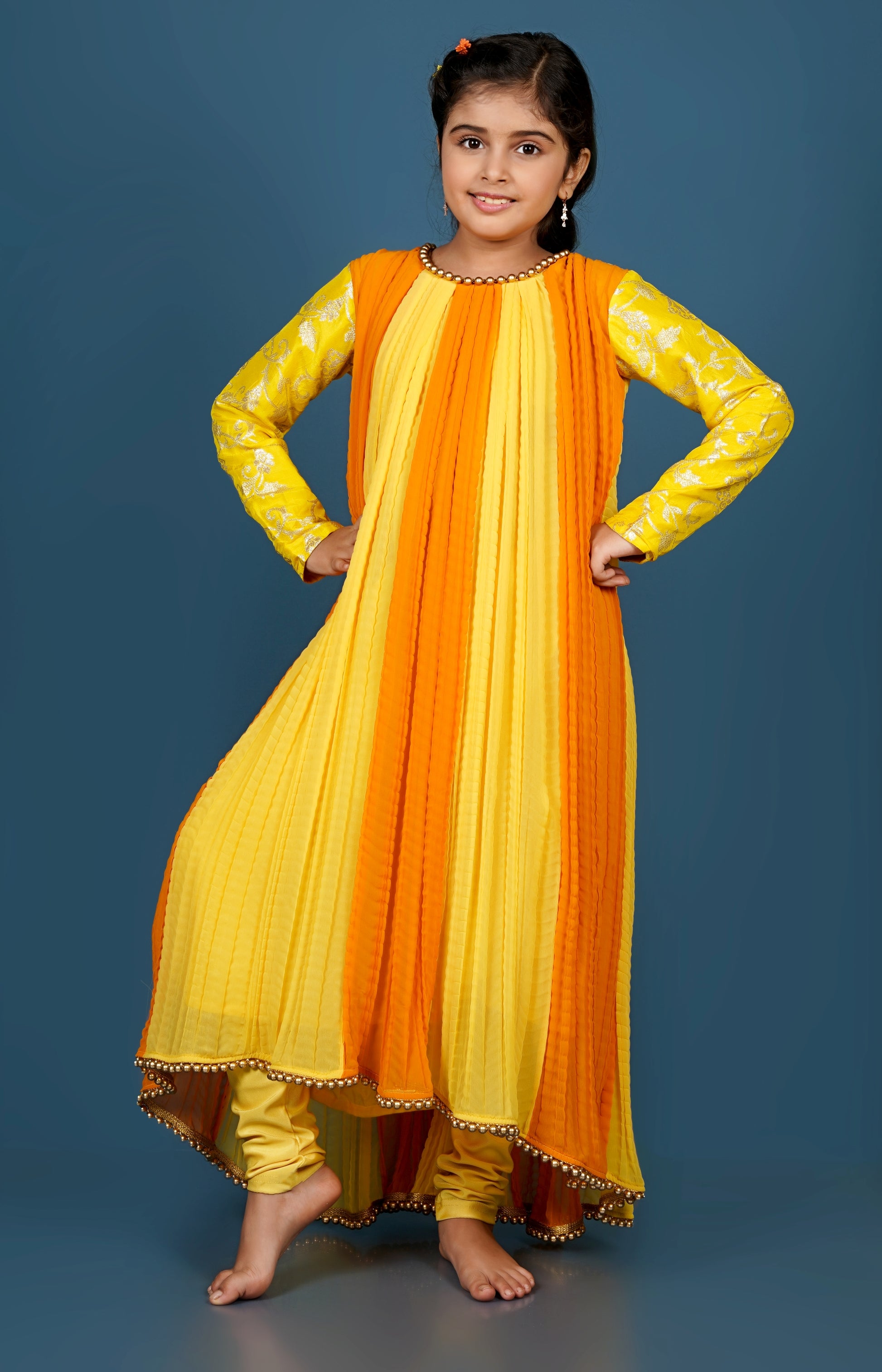 Banarsi full sleeves, high low Kurti with artificial golden pearls detailing over neckline and hem